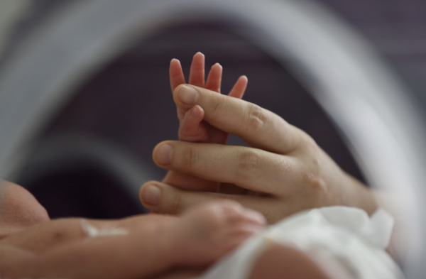 在江苏南京市江宁医院,医护人员跟一个新生儿握手。新华社发(方东旭 摄)
