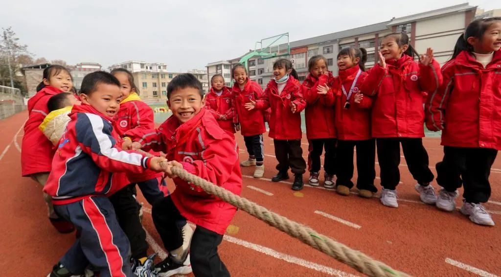 贵州省开阳县第一小学,学生在大课间活动中进行拔河比赛。新华社发(袁福洪摄)