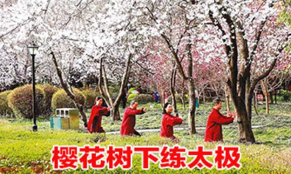 27日,在市区世纪广场,樱花弥漫,一群太极拳爱好者嗅着花香翩翩起舞。舞者中大多是60岁以上的老人,红色的练功服,缓慢轻盈的太极招式与花融为一体,惊艳了欣赏者的眼光。(通讯员 王国良)