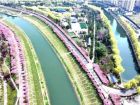 洪河两岸花红似锦,水中亦是青碧芊芊。海棠枝条蔓延,高低错落,疏影横斜,延伸到楼顶、天空,雨中更显妩媚娇艳。沾衣欲湿海棠雨,吹面不寒杨柳风。蒙蒙细雨中,片片花瓣随风对影而落,泛起的层层涟漪不正是洪河荡漾的春心吗?于是,给人这样一种感觉:不是江南,胜似江南。