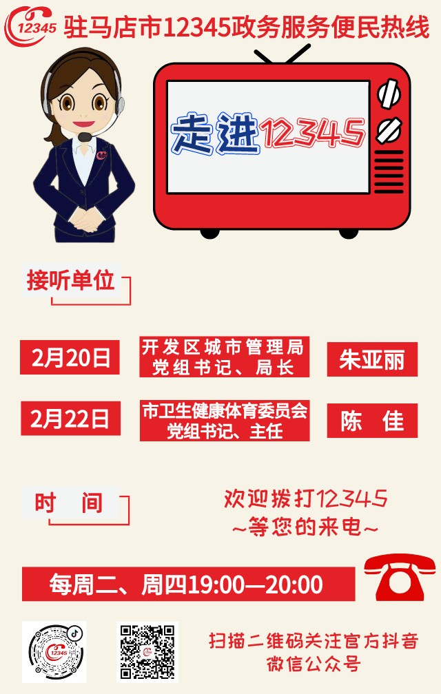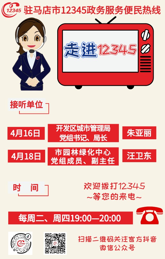 据悉,按照《驻马店市人民政府办公室关于建立市直单位现场接听12345热线电话制度的通知》《驻马店市12345政务服务便民热线中心关于2024年4月份市直单位、中心城区区直单位及乡镇(街道)现场接听12345热线电话的通知》相关要求,4月16日晚开发区城市管理局党组书记、局长朱亚丽,4月18日晚市园林绿化中心党组成员、副主任汪卫东现场接听12345热线电话,欢迎广大市民就相关问题来电。