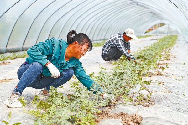 4月14日,在正阳县皮店乡卢寨村小张庄村,村民张道平和妻子正在西瓜种植基地大棚内给西瓜苗整枝、打芽、拉藤。张道平是当地有名的西瓜种植能手,他自己种植了30多亩西瓜,还免费帮村民管理西瓜100多亩。