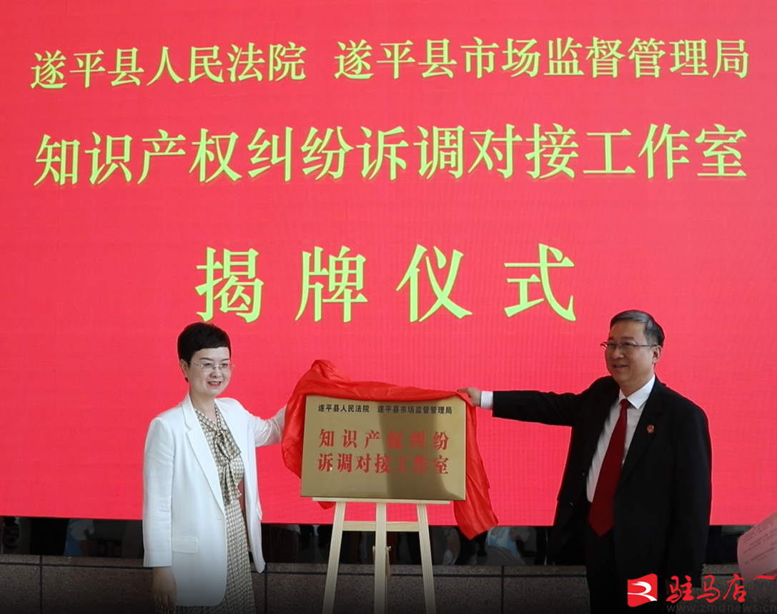 驻马店网讯(通讯员 程云霞 李 娟)4月26日上午,“遂平县知识产权纠纷诉调对接工作室”在遂平县人民法院揭牌成立。市中级人民法院党组成员、副院长李蔚涛,市市场监督管理局总检验师彭飞,遂平县委常委、政法委书记王月红,遂平县政府副县长周倜,遂平县人民法院党组书记、院长刘冬,遂平县市场监督管理局局长刘戈出席,县人民法院和县市场监督管理局有关同志参加。