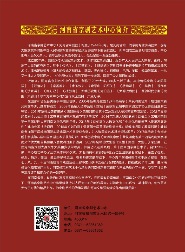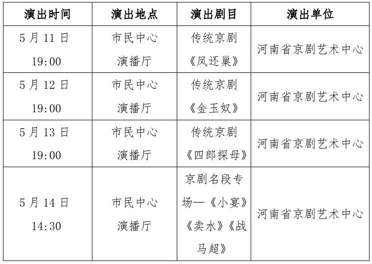 为传承优秀传统文化,满足人民群众高品质精神文化需求,根据省委宣传部安排,2024年“中原文化大舞台”系列演出正式启动。5月11日—14日省京剧艺术中心将在驻马店市民中心演播厅演出4场经典剧目,欢迎戏迷朋友们前往观看!
