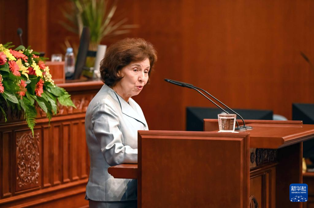 5月12日,达夫科娃在北马其顿斯科普里的就职仪式上发言。新华社发(托米斯拉夫·格奥尔基耶夫摄)