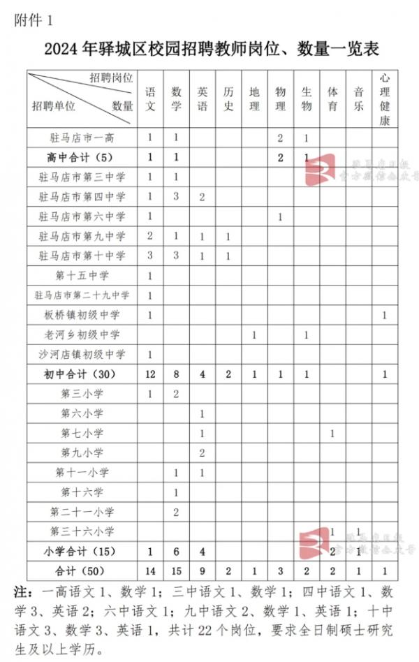 拟招聘高中、城区初中、城区小学、乡镇中学教师共计50人。具体岗位详见《2024年驿城区校园招聘教师岗位、数量一览表》(附件1)。