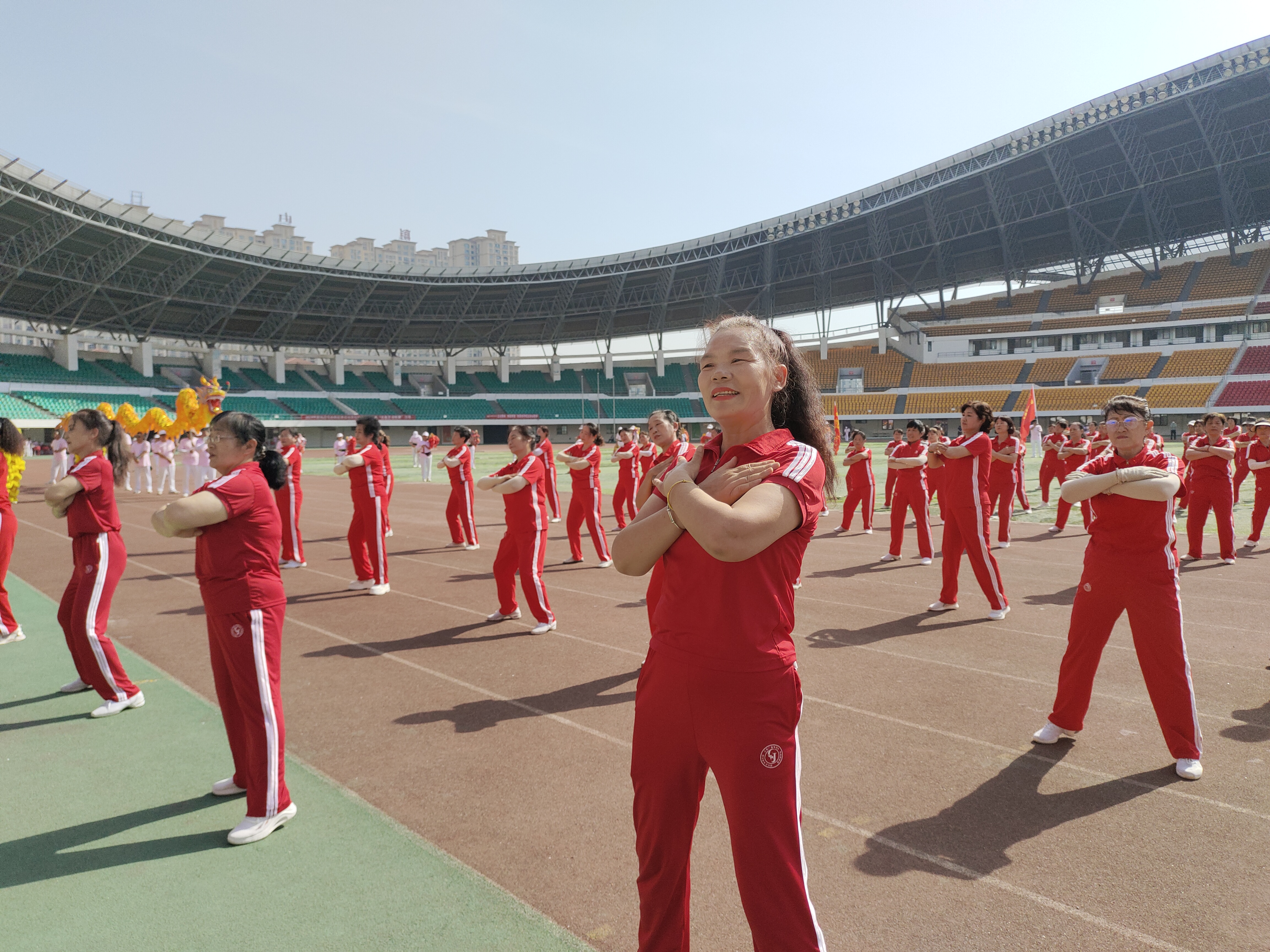 启动仪式结束后,进行了大型全民健身活动展示。市广场舞协会展演大型舞蹈《中华民族一家亲》、健身鞭协会表演活力四射的《龙腾狮跃新时代》、手杖操、盘鼓舞依序进行,欢快的音乐,动作流畅自然,充满激情与活力,不仅给观众带来一场美轮美奂的视觉盛宴,更传递了一种积极向上、健康快乐的生活态度。