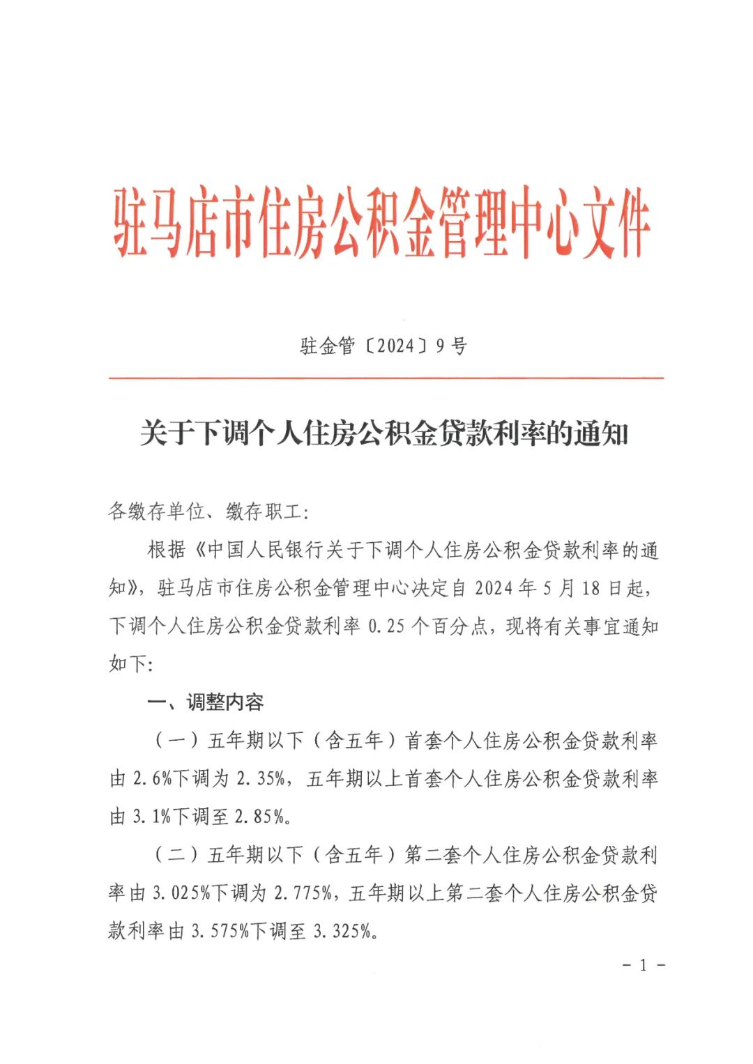 根据《中国人民银行关于下调个人住房公积金贷款利率的通知》,驻马店市住房公积金管理中心决定自2024年5月18日起,下调个人住房公积金贷款利率0.25个百分点,现将有关事宜通知如下: