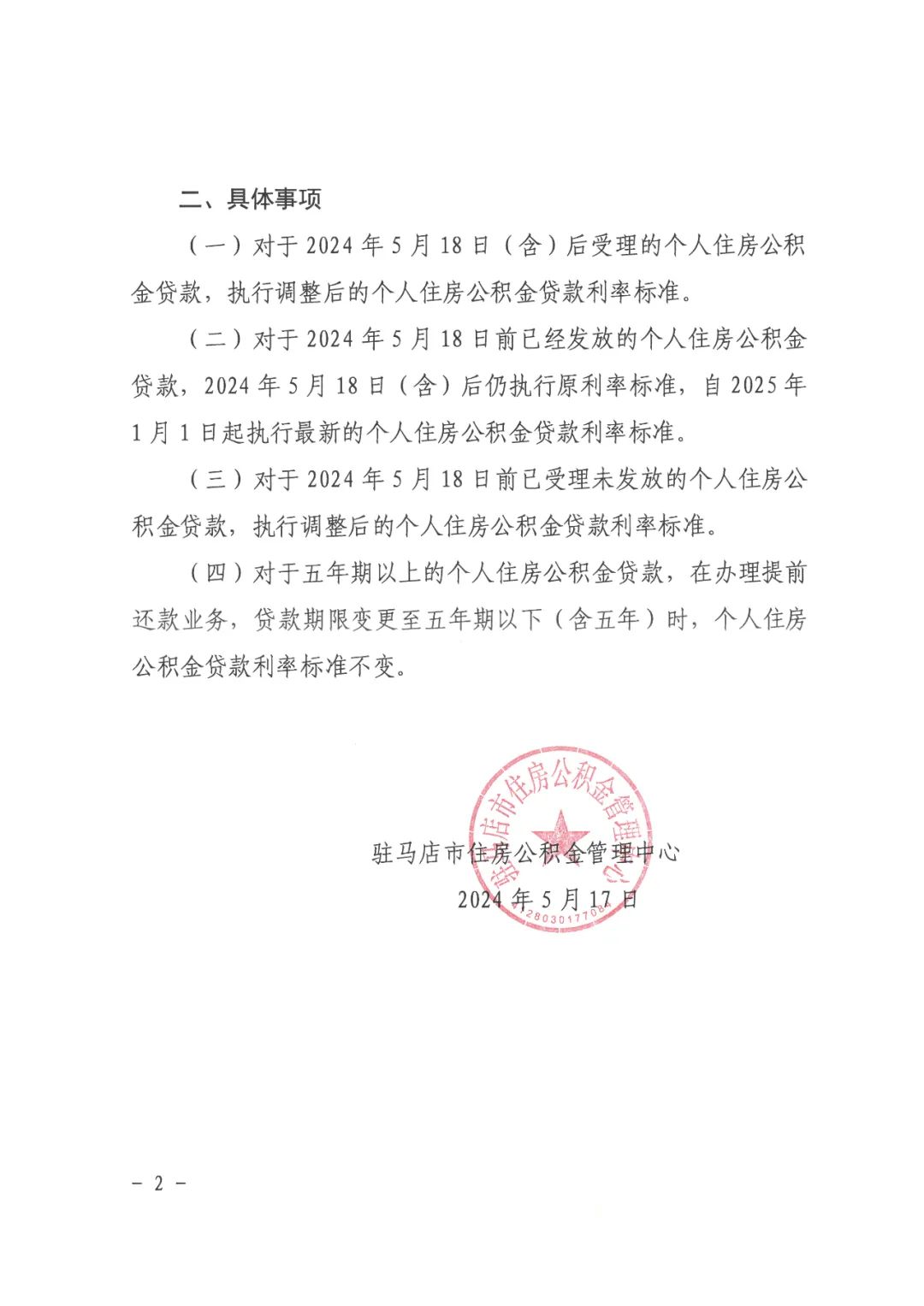 (一)对于2024年5月18日(含)后受理的个人住房公积金贷款,执行调整后的个人住房公积金贷款利率标准。