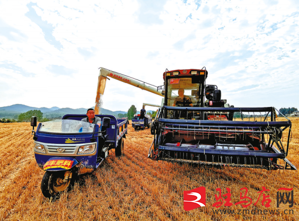 5月21日,确山县任店镇陈门店村村民利用晴好天气抢收小麦,确保颗粒归仓。当地政府部门组织党员干部组成“三夏”服务队,协助村民抢机收、抢晾晒,安排对接粮食收储企业及时做好粮食收储转运工作,让种植户吃下“定心丸”。