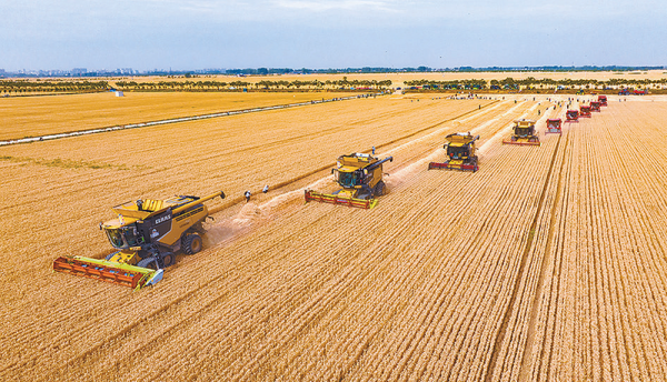 5月29日,在河南省驻马店市西平县老王坡高标准农田,当地种粮大户联合农机合作社举行小麦开镰收割仪式。这是机收编队在收获小麦。 新华社发(赵永涛/摄)