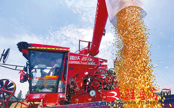 5月28日,在遂平县石寨铺镇,金色麦浪随风涌动,一台台收割机在麦田中穿梭,金黄的麦子从收割机中“吐出”,一派丰收景象。 记者 陈司 摄