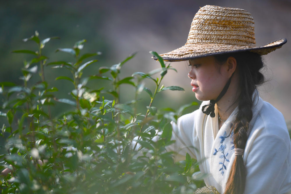 3月26日,肖珺景在河南省信阳市浉河区的茶园内采茶。新华社记者 郝源 摄