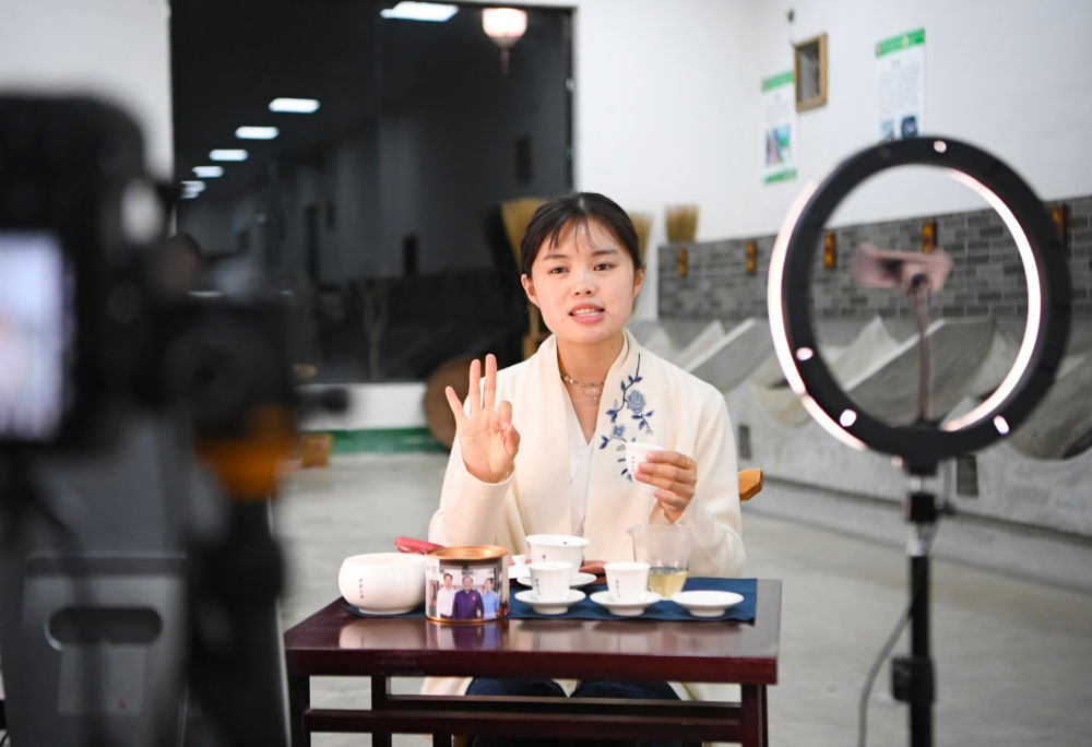 3月26日,在河南省信阳市浉河区土门村,肖珺景在网络平台直播推广茶文化。新华社记者 郝源 摄