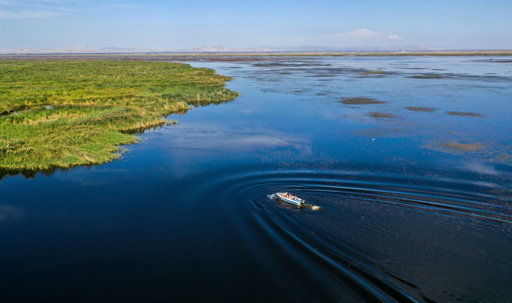 2023年9月15日,河湖湿地水环境保护与修复技术研究团队在内蒙古乌梁素海采集湖水样本(无人机照片)。位于黄河“几字弯”顶部的乌梁素海,是黄河流域最大的湖泊湿地,是控制京津风沙源的天然生态屏障。近年来,当地不断加强乌梁素海综合治理力度,生态环境持续好转。