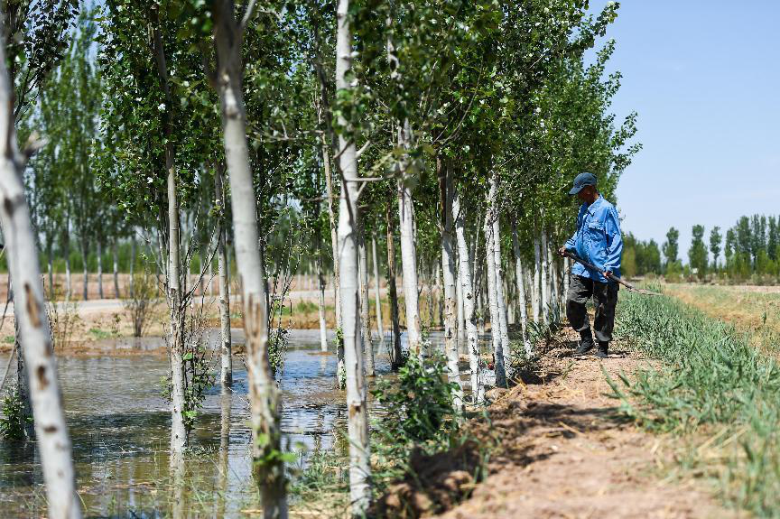 工人在内蒙古巴彦淖尔临河区国营新华林场管护树木(2024年5月26日摄)。数十年来,林场结合“三北”防护林、京津风沙源治理、低质低效林改造等生态工程,持续提高森林覆盖率。