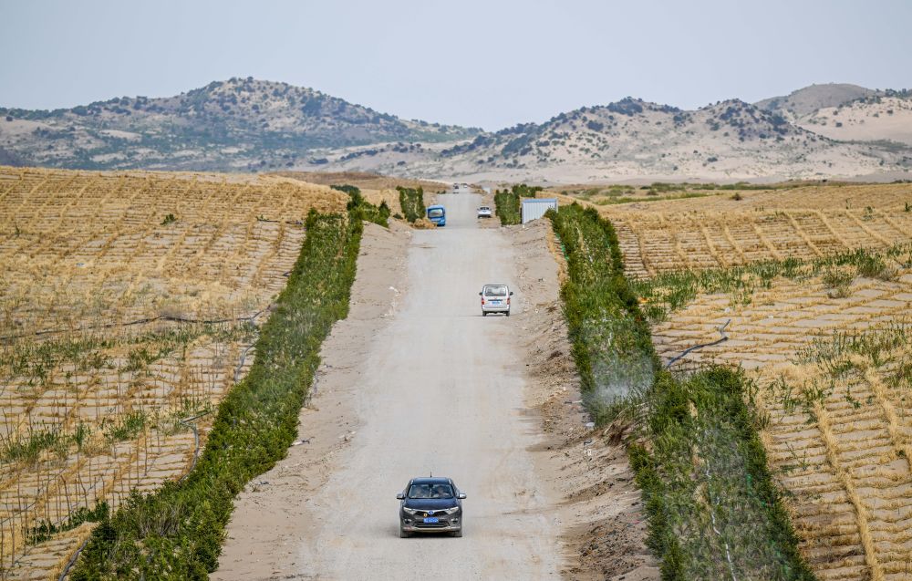 在内蒙古赤峰市翁牛特旗巴彦呼交嘎查其白线防沙治沙项目区,穿沙公路将沙地切割,沙丘被逐步固定(2024年5月16日摄,无人机照片)。