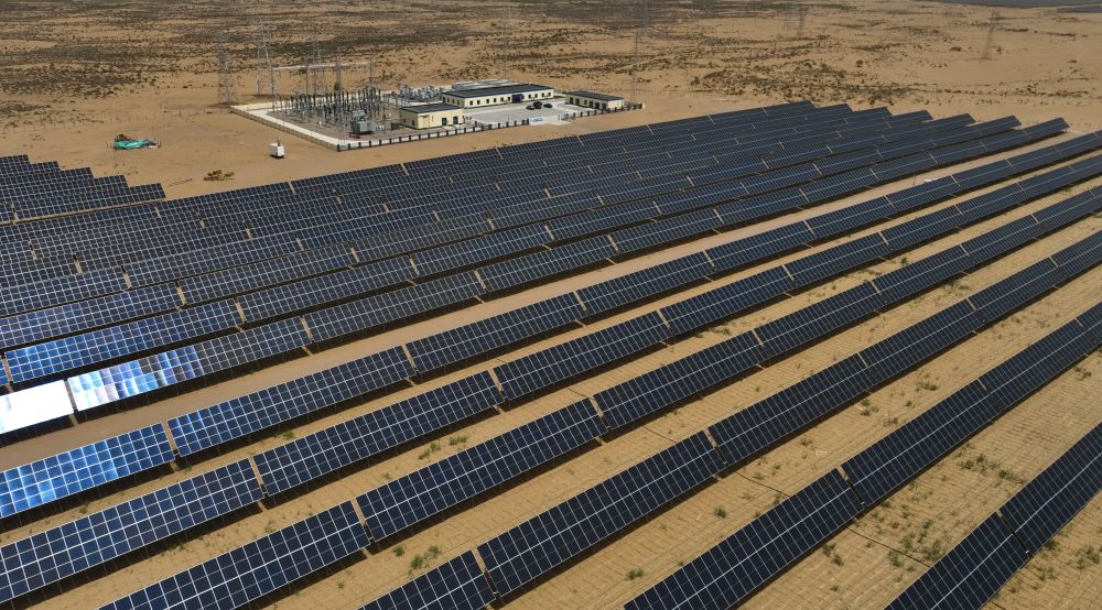 2024年5月16日在内蒙古巴彦淖尔市磴口县拍摄的乌兰布和沙漠光伏基地(无人机照片)。乌兰布和沙漠建设生态光伏基地,采取板上发电、板下种植的办法,努力把沙海变为“绿海”。
