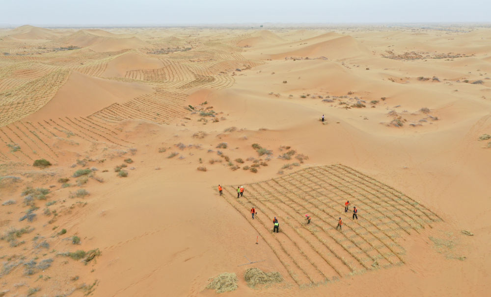 2024年4月27日,治沙工人在内蒙古阿拉善左旗腾格里沙漠s315沿线固沙工程现场用稻草扎草方格(无人机照片)。2024年3月28日,治沙工人在内蒙古通辽市科尔沁左翼后旗阿古拉镇的沙地里打草方格。2024年3月27日在内蒙古通辽市科尔沁区大林镇拍摄的栽植在羽翼袋沙障内的樟子松。
