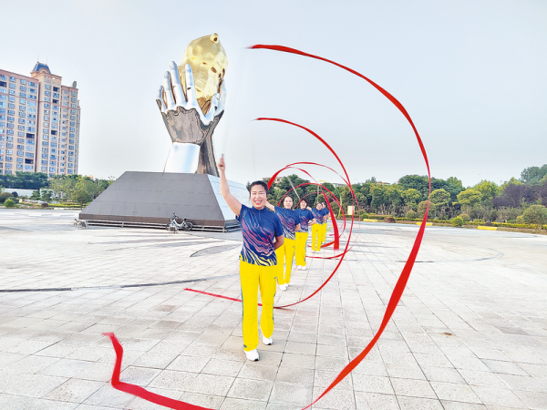 7月5日,正阳县彩带舞爱好者在花生公园排练。近年来,正阳县不断加大文化基础设施建设,硬化各种场地,为广大群众提供休闲娱乐场所,充分发挥文体小广场的阵地优势,推动群众文体活动深入开展,丰富了群众的业余生活。 通讯员 贺永明 摄