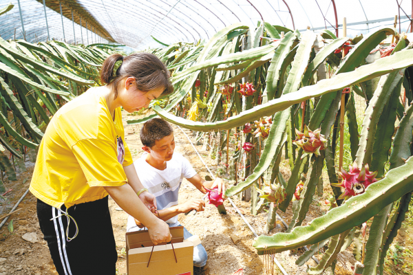 7月15日,在遂平县嵖岈山镇常韩村火龙果种植基地,果农正忙着采摘火龙果。该村负责人介绍,火龙果采摘后,果农采取“线上销售 自由采摘”的方式,很快销售一空。通过特色种植,村民鼓了腰包、红了日子。
