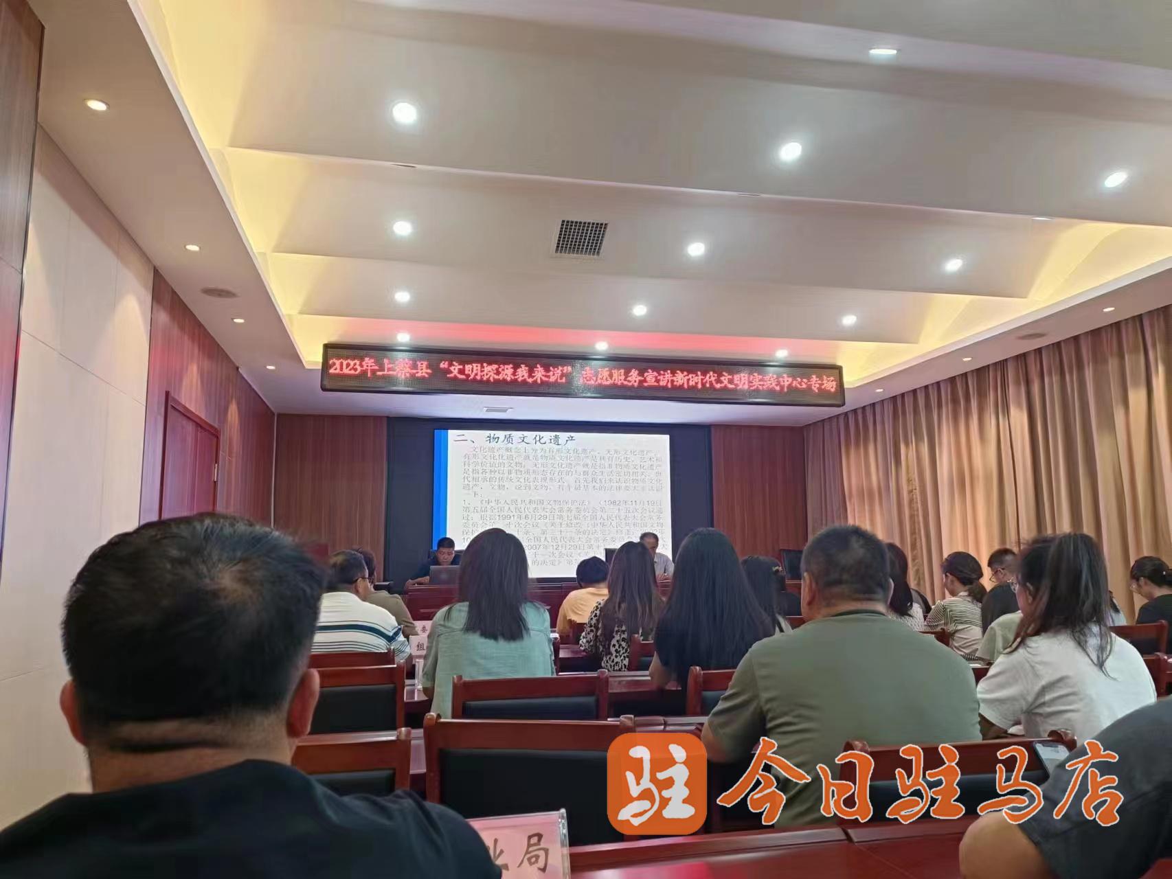 驻马店网讯(记者 王晓晶 通讯员 刘书敏)7月25日,驻马店市上蔡县在新时代文明实践中心开展2023年“文明探源我来说”文物和文化遗产保护志愿服务宣讲活动。上蔡县文化广电和旅游局宣讲员郭建波从认识文化遗产、物质文化遗产(文物)、非物质文化遗产(民族民间传统文化)、文化遗产欣赏四个方面,用通俗易懂的语言和喜闻乐见的方式,深入讲解上蔡县特色地域文化,使现场观众对文物和文化遗产保护工作有了更深层次的认识。