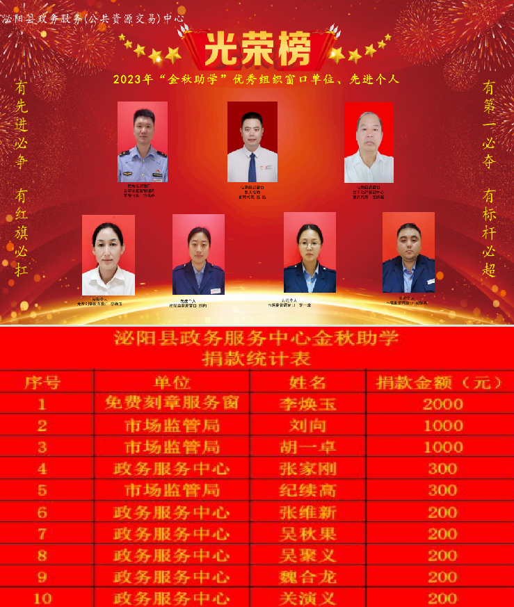 驻马店网讯(记者 方祥 通讯员 邓敏)百年大计、教育为本,守望相助、扶危济困。捐出一份爱心,传递一片真情,真情点燃希望,爱心成就梦想。为保障泌阳县品学兼优的困难学生顺利进入大学校园,近日,泌阳县政务服务中心积极响应县委、县政府号召,组织开展2023年“金秋助学”圆梦募捐活动。至目前共捐款14290元,在泌阳县直单位捐款金额中排名第一。