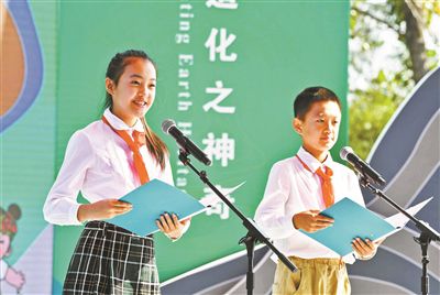 延庆世界地质公园的小志愿者诵读了设立“地质公园日”的绿色倡议书摄影/本报记者 魏彤