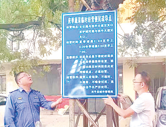驻马店网讯(记者 许 静 见习记者 陈 培 通讯员 侯 阳)为更好地服务广大群众,让城市生活更便利,近日,西平县按照“方便居民、疏堵结合”的原则,科学谋划,合理规划,划定了应季蔬菜临时经营便民疏导点,设置了提示牌,引导零散、无序的流动菜农到划定的范围内规范经营,充分体现了“管理有温度、执法有力度”的便民服务意识,提升了城市管理的人性化、精细化水平和文明程度,助力文明城市长效管理。