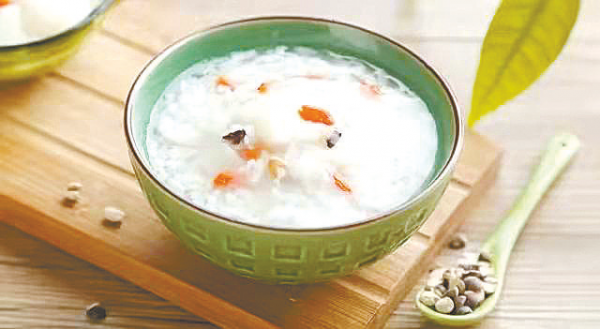 做法:糯米用清水浸泡半小时,将洗净的山药、马蹄去皮后切成丁备用,糯米入锅加入清水大火煮开,再转小火慢炖,出锅前撒枸杞即可食用。