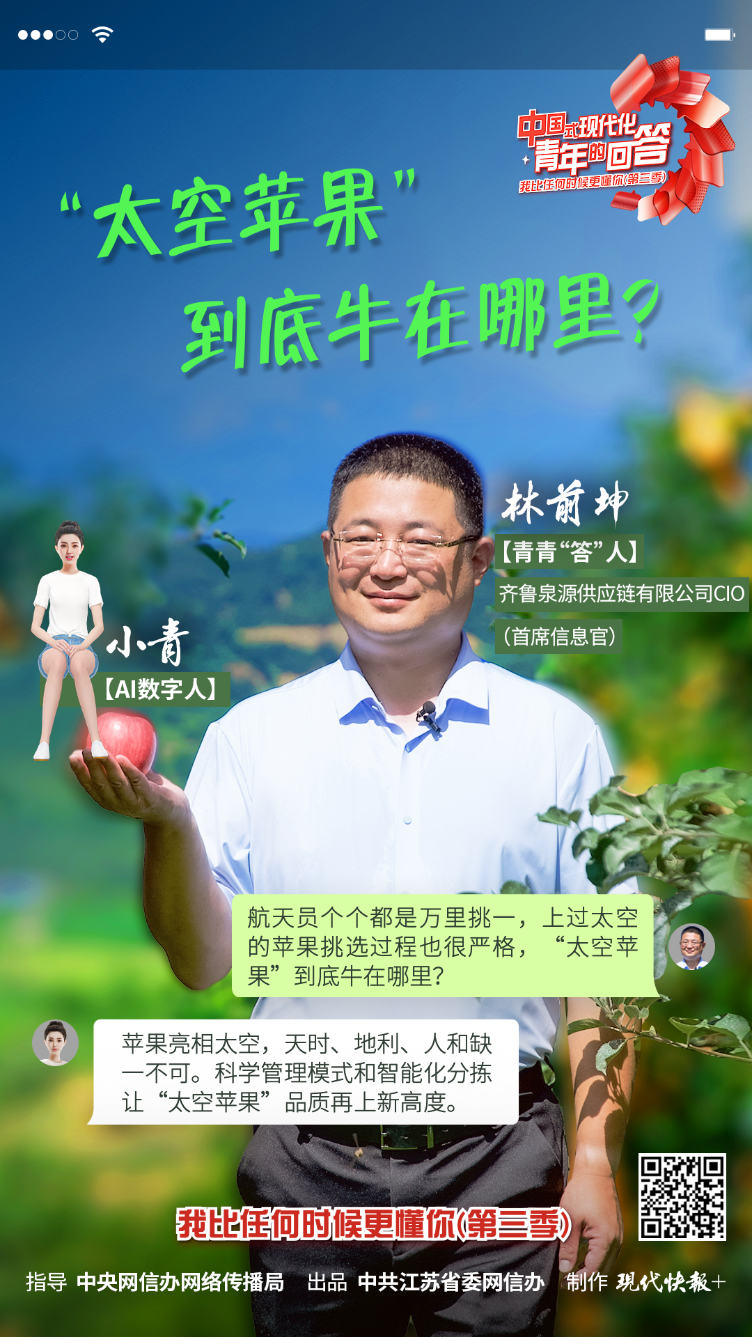 11月1日,“中国式现代化·青年的回答——我比任何时候更懂你(第三季)”系列短视频之《“太空苹果”到底牛在哪里?》正式上线。本集视频中,青青“答”人——齐鲁泉源供应链有限公司cio(首席信息官)林前坤和ai数字人小青,带大家从果园走到智能分选车间,再到大数据平台,全流程了解同款“太空苹果”。
