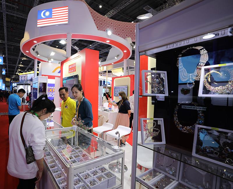 △2023年11月6日,参观者在第六届进博会国家展马来西亚展台欣赏展出的珠宝首饰。