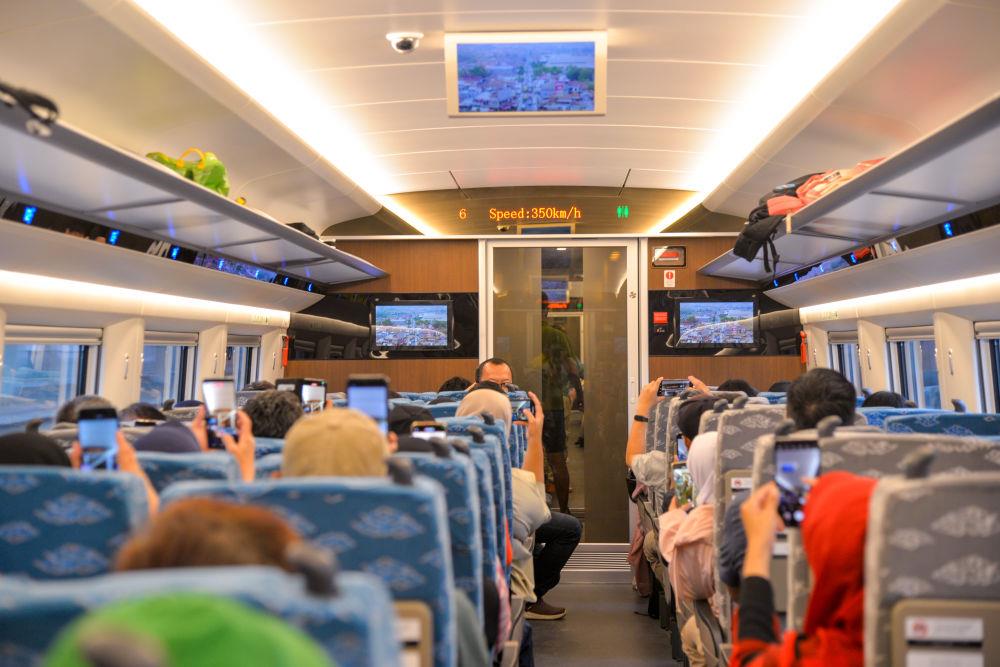 △2023年11月5日,在行驶中的雅万高铁高速动车组列车车厢内,乘客纷纷用手机拍摄显示列车时速达到350公里的电子屏。