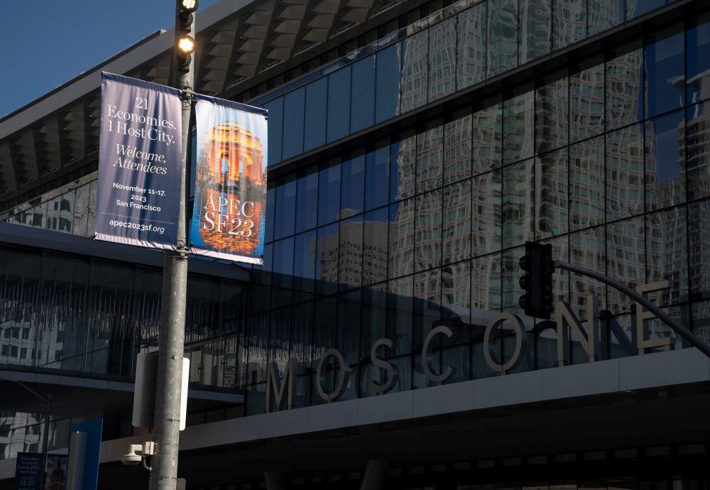 △近日,美国旧金山亚太经合组织会议场地外的宣传海报。